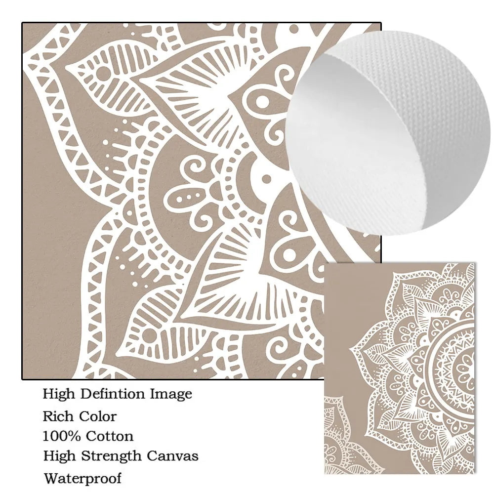 - Whispering Mandala Bloom (beige half-mandala with intricate henna-style details)
