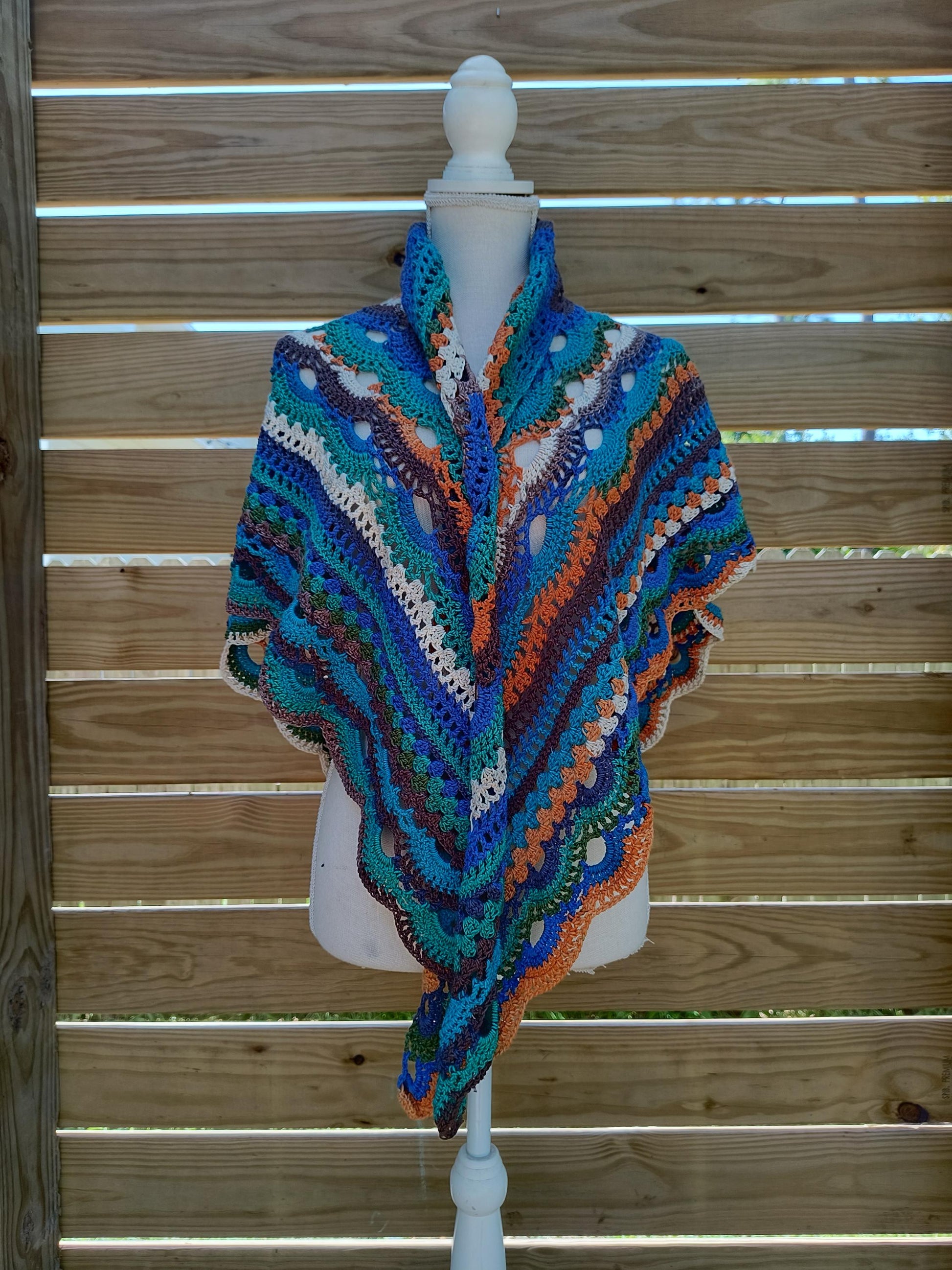 A hand-crocheted prayer shawl alive with the iridescent splendor of peacock plumage—deep sapphire flowing into emerald fire, turquoise lagoons, molten amber accents, rich chocolate depths, and subtle flashes of ivory, moss, and copper that catch the light like hidden jewels.The beloved virus lace pattern unfurls in hypnotic waves, creating a drape that moves like water and wind—light enough for warm evenings, substantial enough to envelop in comfort during cooler seasons. Each stitch forms a seamless, flowing triangle that rests with effortless grace over the shoulders.